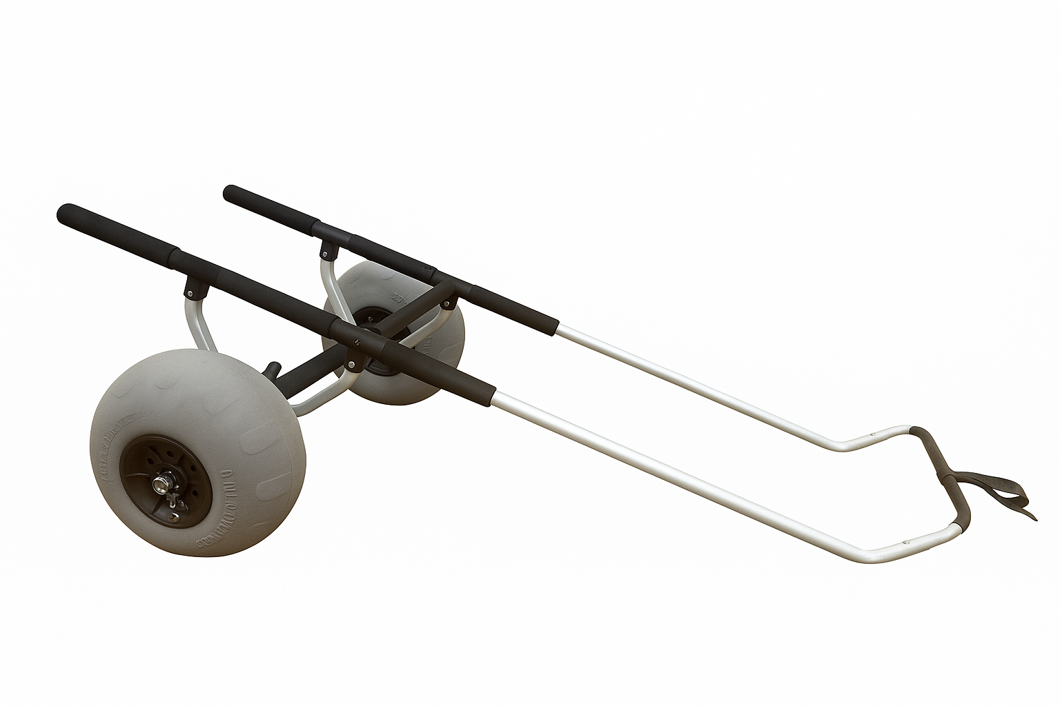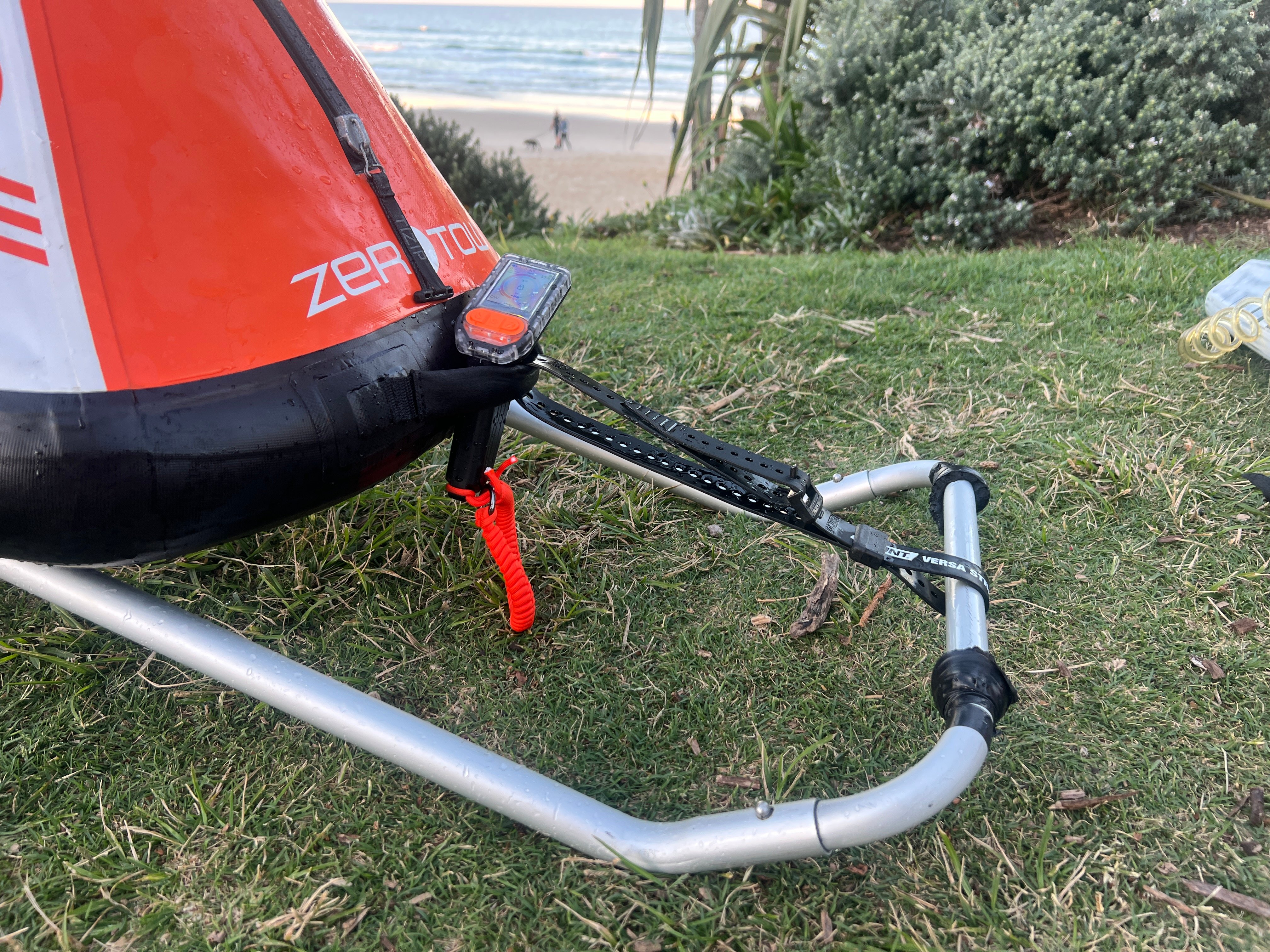 Remove the strap from the front handle of the Boogie and put it around the handle of the trolley. This is all that is needed to secure the Boogie to the trolley for transport and makes launching easy.When walking to the beach, place the remote in the front handle of the Boogie and turn it on to get GPS reception while walking to the beach.